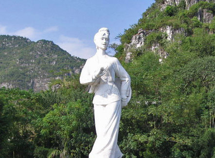 廣西宜山壯族傳說,劉三姐生于唐中宗神龍元年(703年),從小聰慧過人,能歌善唱,被視為"神女"。12歲即出口成章,妙語連珠,以歌代言,名揚壯鄉。后曾到附近各地傳歌。慕名前來與她對歌的人絡繹不絕,但短則一日,長則三五天,個個罄腹結舌,無歌相對,無言以答,羞赧而退。然而她的才華卻遭到流氓惡霸的嫉恨,后被害死于柳州。傳說她死后騎鯉魚上天成了仙。也有的說她在貴縣的西山與白鶴少年對歌七日化而為石。還有的說財主莫懷仁欲娶她為妾,三姐堅決反抗,莫買通官府迫害三姐,三姐乘船飄然而去,等等。