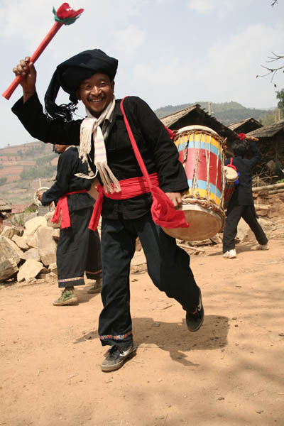 每個民族都是能歌善舞的民族,我們不例外。我們布朗族的舞蹈是全民性的,白發老者、少年兒童只要聞聽竹笛響,便會翩翩起舞。而年輕人特別喜歡跳“圓圈舞”。先由能歌善舞的小伙子領舞,伴隨著铓鑼、象腳鼓的節奏,姑娘們、小伙子們圍成一個圓圈,雙膝微微起伏。柔軟的雙手在肩兩側或前或后輕盈翻舞,邊舞邊向反時針方向移動腳步。同時,一群小伙子在圈內有節奏的作虎步跳躍。時而分散到姑娘面前與姑娘輕聲對歌,時而又聚攏,作虎跳狀。如此循環反復,盡情抒發心中的喜悅。