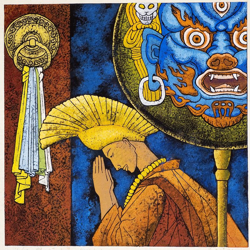 “祥巴”,藏語音譯,意為木刻版畫。藏族祥巴不同于藏族傳統(tǒng)的佛經(jīng)版畫,也不同于近現(xiàn)代新興版畫,是當代畫家在藏族傳統(tǒng)文化基礎(chǔ)上發(fā)展出來的新的藏族版畫,從內(nèi)容到形式都具有強烈鮮明藏族特色的新版畫。“藏族祥巴”不僅在繪制上采用獨樹一幟的表現(xiàn)方式,而且在顏料和用紙應(yīng)用上也不斷探索和創(chuàng)新,藏族祥巴的繪畫顏料采用產(chǎn)于雪域高原的天然礦、植物原料,色澤純正、品質(zhì)優(yōu)異,耐光極佳,耐候性極強,而藏族祥巴的用紙是用產(chǎn)生高原雪域的狼毒草、沉香等為主要原料,經(jīng)數(shù)十道工序手工制作而成的藏紙,具有防腐、防蛀、防潮的特性。