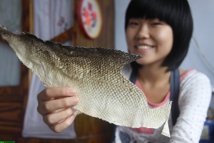 我們有幸接觸到赫哲老藝人孫玉林伯伯,他是從2000年就開始做魚皮衣了,在2005年申請到了省級非物質文化傳承人,聽他給我們講做一套魚皮衣就要用十多斤的大馬哈魚七八十條,而每年大馬哈魚群又只是在9月中旬的時候出現一次,因此格外珍貴,價格也不菲,一套魚皮衣要上萬元,現在作為一種工藝品也是受到很多游客的青睞。而在以前由于沒有布料所以人們就用打來的大魚剝下皮來做衣服(不過這里我很是疑問,冬天穿魚皮衣沒布的話那魚皮衣里面要套些什么的好啊)。魚皮一直以來給我的感覺都是軟軟的柔柔的,一戳就破,以至孫伯給我們展示魚皮衣的時候摸它都不敢用力,可孫伯告訴我們,大馬哈魚皮真正的拉力是牛皮拉力的七倍左右,很有韌性。以前人們冬天穿的魚皮鞋很單薄,冬天穿著顯然是冷,于是就把里面塞上些打成棉花樣的靰鞡草,一雙鞋穿上四五冬一點問題都沒有。而做衣服余下的邊角料就可以很創造性地做些小飾品,或專門用料做成一幅幅精致魚皮畫。