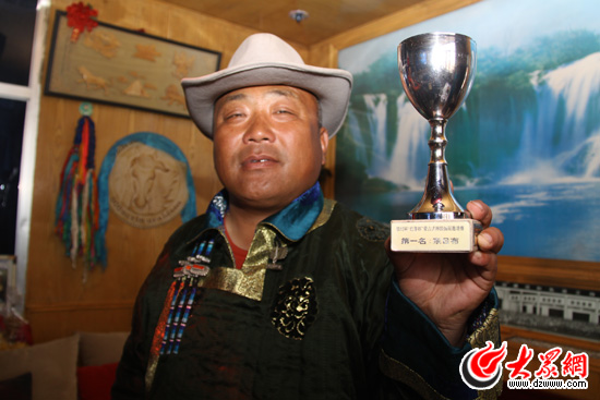 與賽馬同樣被蒙古族重視的,就是“搏克”了,搏克就是蒙古式摔跤,在東日布家里堂屋的窗臺上,擺滿了各種各樣的獎杯獎牌和證書,這些基本上都是東日布年輕的時候參加搏克比賽獲得的,其中有他最喜歡的一個銀杯,那是1998年在法國巴黎舉行的第四屆蒙古式摔跤國際邀請賽上拿到的,“第一名東日布!在世界上代表中國的蒙古族露臉了,高興,非常高興!”那時候東日布35歲。