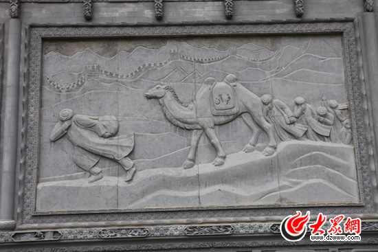 駱駝泉內(nèi)最醒目的是一面長約40米的石雕墻,由八塊石質(zhì)浮雕組成。為什么是八塊呢?韓占祥說:“一,撒拉族東遷歷史是八百年;二,撒拉在滿清有八宮,現(xiàn)在是八個鄉(xiāng)鎮(zhèn);三,街子有六門八戶;四,2008,中國實現(xiàn)了百年奧運夢想;五,中國人最喜歡阿拉伯?dāng)?shù)字8,因此我用8塊浮雕表現(xiàn)撒拉族東遷史。”
