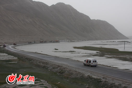 昨天采訪團接到邊防公安派出所山東老鄉路通電話,趕到前幾天水毀路段時,已經是20:30分。經過5天的緊急搶修,此時堰塞湖的水位緩慢消退到高底盤的大卡車勉強可以通過的程度。有著豐富自駕遠行經歷的領隊施曉亮與20多年駕齡的王偉商量后,決定跟著一隊大貨車涉水。但一下水二位自駕高手就有點后悔了:水淹路面完全與湖面混為一體,行車其上仿佛湖面行舟,有幾輛大貨車因為看不到水下的柏油路面而開下泡軟的路基,等待救援。公羊車的底盤雖然不算低,但有一段100多米的路段水深沒過大貨車車輪的一半,淹沒我們公羊車車輪的大半,而公羊車尾的排氣管完全淹沒在水中。如果停止加油,就有水進入排氣管被"淹"息火的危險,而持續加油則會與前方小心翼翼行駛的大貨車追尾。