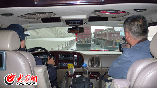 藝高人膽大的王偉,一腳踩剎車,一腳踩油門,緊跟著前面大車的車尾正中間,確保壓著結實的路面行駛。副駕駛席上的施曉亮則探出身去用攝像機拍攝。這100多米的路段好不容易捱了過去,當大家松一口氣時,王偉夸張地抹了一把汗說:“我的褲子怎么濕了?”大家哈哈大笑,車內的氣氛頓時輕松起來。