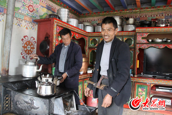 在簡單的交談后,多布登上了采訪車,引領我們到他家做客。當汽車緩緩剛駛入村頭,施曉亮認出了10年前的那些房子,當年門巴族人剛從被泥石流沖垮的排龍鄉搬到此地,多布登一家也是剛剛住進了政府給蓋的新房子。10年后,再次迎來媒體的朋友們,多布登用還算熟練的漢語告訴我們,他和老伴像過年一樣高興。一碗碗熱騰騰的酥油茶緩解了旅途的勞頓,大家開始參觀起這個典型的門巴族家庭的小院。
