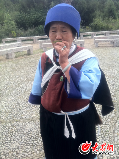 沿著一條兩旁開滿格桑花的山間小路,我們步行了約30分鐘后進入了民族村。剛進村,我們便被一種類似豎笛吹出的優美旋律吸引,循著聲音我們來到了民族廣場。在這里,我們碰到了納西族藝人玉蘭老人,原來這美妙的樂曲是她用樹葉為游客吹奏的納西民歌。得知我們遠道而來,玉蘭老人說要為我們演奏一曲,而且歌曲由我們隨便點,無論是民歌還是流行歌曲,她都能用樹葉吹奏。帶著試探的語氣,領隊施曉亮點了一首《青藏高原》,玉蘭老人聽后微微一笑,隨便從身旁的一顆樹上采下一片樹葉,便開始吹奏起來,曲聲悠揚,響徹山谷。一旁的我們只有呆呆得聽得入了神,甚至連天空何時下起了雨都完全不知,只是對這神奇的樹葉產生了無限遐想。