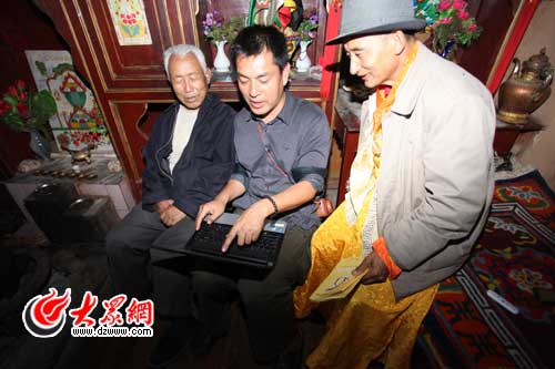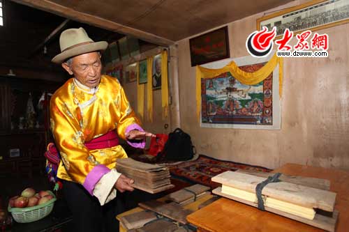 大眾網-聯(lián)通3G麗江9月29日訊(特派記者 王磊 特約記者 施曉亮)28日,“黨旗漫卷中國紅——走進56個民族家庭”采訪團離開瀘沽湖,來到麗江市下轄的寧蒗彝族自治縣。在81歲普米族德高望重的民族文化專家胡鏡明老人家中,我們不僅了解到了普米族鮮為人知的歷史,而且施曉亮也有意外收獲——他遍尋不見的十年前的采訪對象,都在胡老家中意外相遇:一位是十年前寧蒗縣新營盤鄉(xiāng)牛窩子村韓規(guī)文化學校從四川請來的韓規(guī)老師麥色偏初,另一位是十年前剛剛退休的縣民委副主任、韓規(guī)學校的發(fā)起人馬洪升,其實他們十年前就是與胡鏡明先生一起創(chuàng)辦韓規(guī)學校、致力于民族文化的保護。這十年來,以他們?yōu)槭椎氖畮讉普米族有識之士組成的普米文化保護中心,一直在竭盡全力進行搶救韓規(guī)經書、傳播普米文化的工作。這些老中青三結合的普米族精英,以民間的力量,或深入鄉(xiāng)間村寨收集即將消逝的經文、或潛心整理普米語傳統(tǒng)民諺匯編成冊,他們的努力最終得到政府的認可和支持,縣民族小學特別開設了“普米班”。麥色偏初十年間教出的17名徒弟也像當年的他一樣,正在教普米族的娃娃們普米文和本族的傳統(tǒng)習俗。