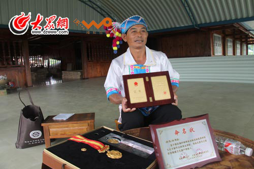 巖瓦洛手中拿的是國家頒發給他的布朗族彈唱非文化遺產傳承人的證書,這個證書讓他感到自己的責任重大。