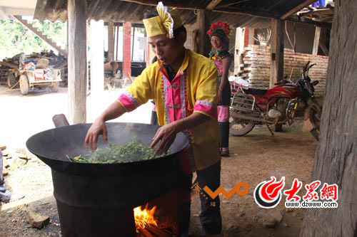 布朗族男子正在給剛采摘的普洱茶用手進行翻炒殺青