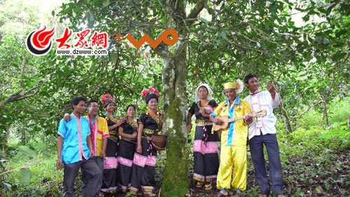 布朗族男女在一起唱情歌,中間是老曼峨村一千三百多年的老茶樹(施哲瑩攝)