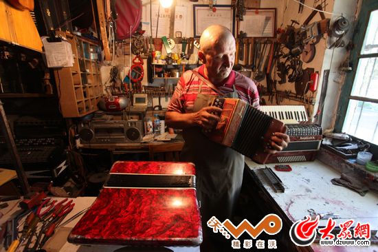 亞歷山大從15歲就開始演習修理手風琴,30年來他都以此為生,因為職業的便利,他也是一位手風琴收藏家,目前已收藏了100多架世界各地的手風琴。他十分樂于向朋友介紹他的收藏,小鋪里一排排貨架上擠擠挨挨的手風琴。他會詳細地為客人講哪一架是德國的,哪一架是波蘭的,當然還是俄羅斯的最地道,他一邊講一邊逐個彈奏一番,講解三排鍵雙排鍵和單排鍵各有什么特點,樂此不疲。有些手風琴盡管式樣陳舊,年代久遠,甚至有上世紀中葉制造的老古董,從擱架上取下來,拂去浮塵,照樣可以拉出悅耳的音樂。