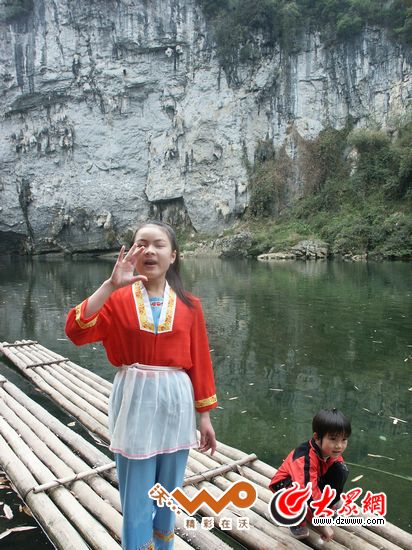 如今宜州成歌海,都是三姐親口傳。小劉三姐在下枧河中的竹排上放歌(施曉亮 攝)