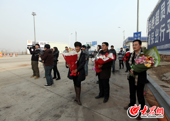 12月21日下午1:20,提前得知采訪團將凱旋消息的采訪團成員親朋及省、市級媒體記者30余人,早早地趕到繞城高速濟南南高速出口,他們懷抱著大束鮮花,不停向高速收費口方向張望著。
