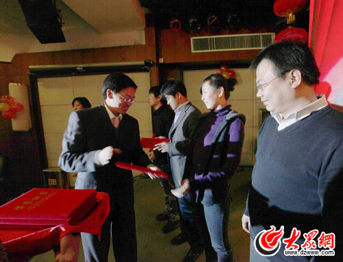 山東大眾傳媒股份有限公司(大眾網(wǎng))董事長(zhǎng)、總經(jīng)理林忠禮為優(yōu)秀員工頒獎(jiǎng)