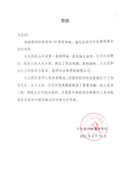 濱州市委宣傳部賀信