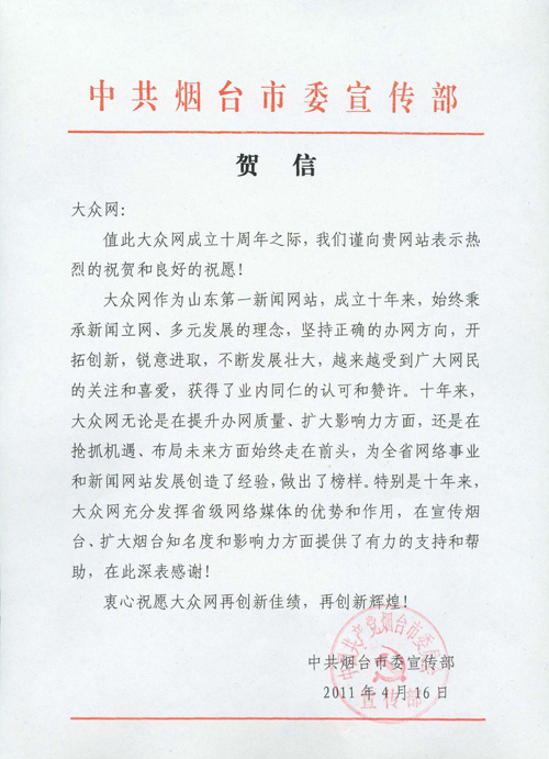 煙臺市委宣傳部賀信