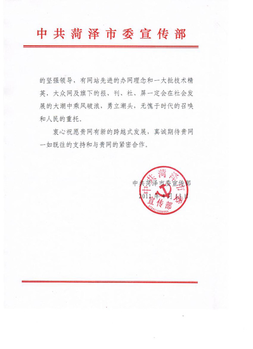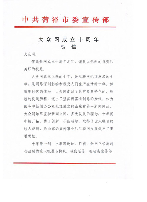 菏澤市委宣傳部賀信