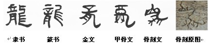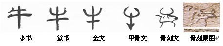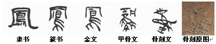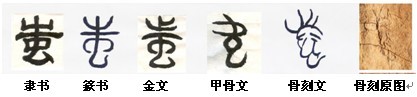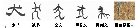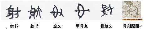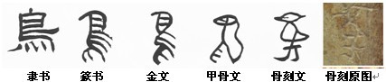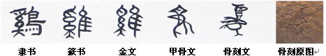 筆者認(rèn)為,根據(jù)甲骨文向金文演變的某些規(guī)律,對(duì)于東夷骨刻文的破譯是非常有必要借鑒的。甲骨文向金文的過渡有幾種情況,一是從具有很強(qiáng)的圖畫性到脫離圖畫的符號(hào)化的演變;一是由繁到簡(jiǎn)的演變;再就是完全照搬,筆畫相同,有的只是在書寫方法上略有變化。當(dāng)然也有少量是由簡(jiǎn)到繁的,這往往是形聲字演變的結(jié)果,有的增加了形旁或聲旁,但基本上是萬變不離其宗,有規(guī)律可循的。而東夷骨刻文向甲骨文的演變也基本上存在這四種情況,只不過由圖畫性向符號(hào)化過渡更為明顯,由象形、指事、會(huì)意向形聲字轉(zhuǎn)變的還不多見。由于借鑒了這一規(guī)律,在劉教授破譯的八個(gè)字的基礎(chǔ)上,筆者一口氣又破譯了近百字。為了便于對(duì)照辨認(rèn),按照漢字發(fā)展和演變的順序,對(duì)這些破譯出的文字分別用骨刻文、甲骨文、金文、小篆和隸書的書體,以書法藝術(shù)的表現(xiàn)形式創(chuàng)作了幾幅題為“中國(guó)文字演變過程”的書法藝術(shù)作品,并在每字后附有骨刻原圖,今取其一,以供讀者參考鑒別。(如圖)