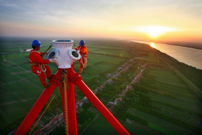 施工人員在特高壓工程長江大跨越進行鐵塔組立