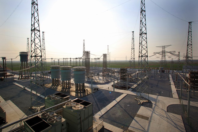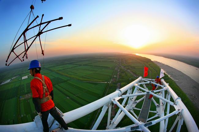 施工人員在特高壓工程長江大跨越進行鐵塔組立