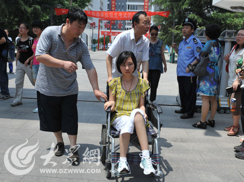 考生小蘇稱骨折不影響高考 最感謝父親 語文考試結(jié)束后,考生小蘇坐輪椅離開考場。父親蘇先生告訴記者:“小蘇3月底發(fā)生意外,從樓梯上摔下,左腳骨折,不能落地。至今已有兩個多月了。”考完第一場,小蘇表示語文題目不難:“雖然受傷了,但是對我的考試沒影響,考的還不錯。感謝我的父親。” 據(jù)了解,小蘇和父母目前租住在山師北街4號,考前上下樓、上課等均由其父親抱或用輪椅推行。(記者 隋喬)