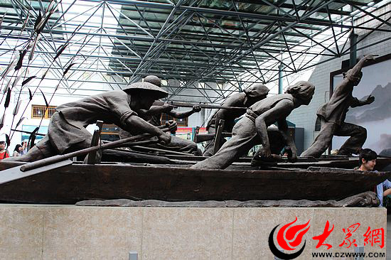 (紀(jì)念館內(nèi)的雕塑) 白洋淀人民有著光榮的革命傳統(tǒng)。在抗日戰(zhàn)爭時期,白洋淀地區(qū)人民成立了著名的水上游擊隊“雁翎隊”,利用河湖港叉開展游擊戰(zhàn)爭,威震敵膽。