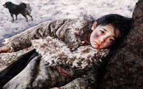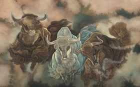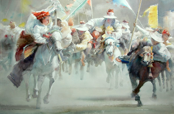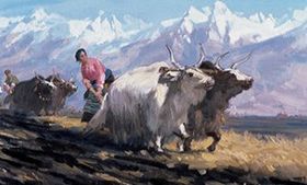 表現藏族賽馬節上騎手們你追我趕的情景。