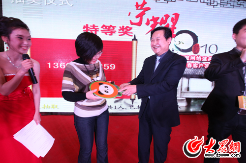 大眾網(wǎng)快訊 在大眾網(wǎng)2010年度網(wǎng)絡(luò)盛典的最后抽獎(jiǎng)環(huán)節(jié),今晚的神秘大獎(jiǎng)價(jià)值5萬(wàn)元的吉利熊貓汽車被來(lái)自中國(guó)完美公司的嘉賓周蘊(yùn)獲得,山東省委宣傳部副部長(zhǎng)劉保聚親自為其頒發(fā)了象征汽車的“金鑰匙”。
