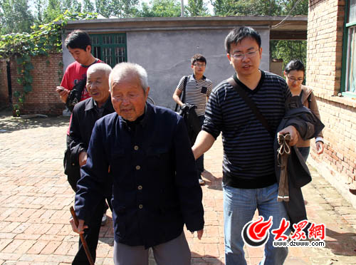 記者尹玉濤與李功祥老人交流。
