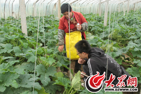走進村民劉恩梅的大棚里,好家伙,這里面可真是暖和啊。不一會記者的眼鏡上就充滿了細細的水珠,看周圍就好像是進入了仙境一般。走在大棚里面,滿大棚的西葫長勢旺盛喜人,劉大姐身上系著黃色袋子,手里拿著一個小小的瓶子,瓶子上面插著一支毛筆。那個黃色的袋子和奇特瓶子引起了記者的好奇心。