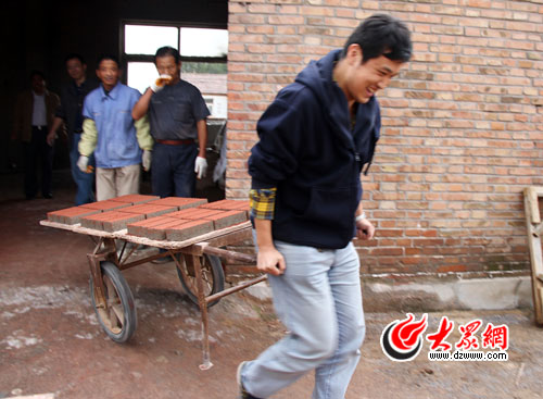 記者們一起搬運“新鮮出爐”的紅磚