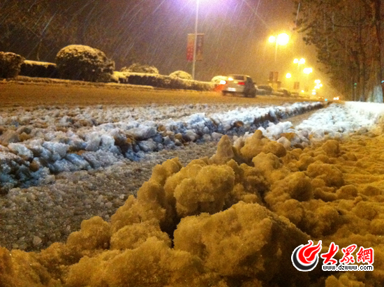 晚上20點(diǎn)30分,記者在濟(jì)南市經(jīng)十東路、二環(huán)南路、旅游路等路段看到,由于降雪量的繼續(xù)增大,路面積雪十分嚴(yán)重,部分更是達(dá)到10公分以上。在市區(qū)東部的燕子山路、花園路、山大路等道路,由于車流量較大,道路中央的積雪已經(jīng)被碾壓成為冰水,當(dāng)有車輛快速開(kāi)過(guò)時(shí),濺起的冰水達(dá)到一米多高。隨著夜間氣溫的不斷降低,部分路面已出現(xiàn)結(jié)冰現(xiàn)象,十分濕滑。為此,山東省氣象臺(tái)于11月29日21時(shí)發(fā)布道路結(jié)冰黃色預(yù)警信號(hào)。