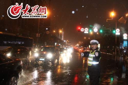 濼源大街上,交警冒雪疏導晚高峰交通。