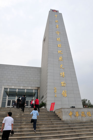 博物館的正面造型像是迎風(fēng)招展的旗幟。右側(cè)的紀(jì)念碑,高度為31.117米,它的寓意為中華蘇維埃共和國(guó)成立于1931年11月7日。左側(cè)是一扇以花崗巖鑲嵌的636平方米巨型浮雕面,旗面內(nèi)浮雕圖案主題為《人民共和國(guó)從這里走來(lái)》。