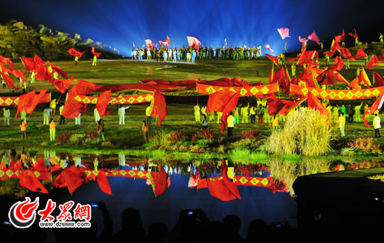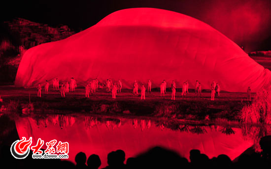大幕徐徐開啟,4000平方米的巨幅紅綢從天而降,漫過烈士的遺體,演化成鋪天蓋地的血海和沖天的紅云。井岡山上,紅旗在召喚革命的隊伍;八角樓上,一盞油燈的微光與北斗星輝映;紅軍駐地,朱德的扁擔挑起軍民魚水情;送別路上,《十送紅軍》的旋律情真意切、催人淚下。炮聲近在咫尺,舉著火把的紅軍戰士在室外劇場中奔跑穿梭,觀眾也成為了“實景演出”的組成部分。逼真的戰場、180度全景式畫面,把現場觀眾帶回80多年前的崢嶸歲月。