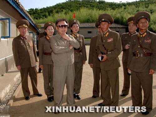 這是朝鮮中央通訊社2008年10月11日公布的朝鮮最高領(lǐng)導(dǎo)人金正日于當(dāng)日視察朝鮮人民軍821部隊的一支女子炮兵連的照片。 新華社/路透(資料圖)