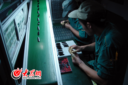 在歌爾的生產車間,工作人員在密閉的工作間內制作電子元件。