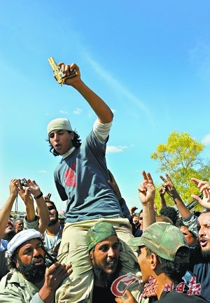 執(zhí)政當局士兵手持繳獲的卡扎菲鍍金手槍慶祝。