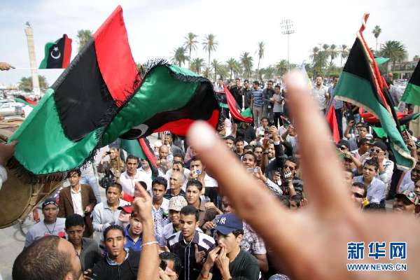 10月20日,在利比亞的黎波里,人們在聽聞卡扎菲已傷重身亡后的消息后游行慶祝。利比亞“全國過渡委員會”執行委員會主席賈布里勒20日在新聞發布會上證實,卡扎菲當天在蘇爾特身亡。新華社發(哈姆扎·圖爾基亞攝)