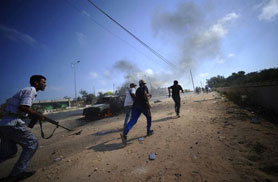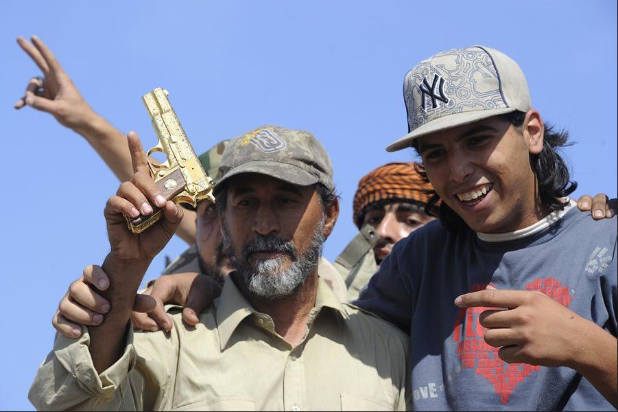 當地時間10月20日,利比亞蘇爾特,利比亞過渡委士兵展示從卡扎菲身上繳獲的金手槍。