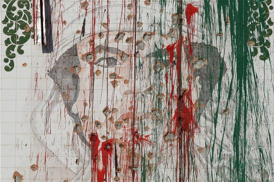 布滿彈孔和油漆的卡扎菲畫像
