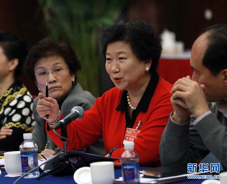 在十一屆全國人大四次會議和全國政協十一屆四次會議上,女代表女委員認真履行職責、參政議政,為國家貢獻聰明才智。她們以特有的溫柔和細膩在履職過程中更多、更敏銳地考慮到百姓的需要,在兩會這個中國最高民主政治的舞臺上,發出一抹抹溫柔的亮色。 3月4日,全國政協委員侯露(右二)在政協小組討論會上說,她在關注民生問題的同時,也十分關注全社會道德建設。她認為,我國的經濟發展很快,但社會的誠信缺失已成為各行各業的一個突出問題。她建議有關部門應認真研究這一課題,提出確實可行的解決措施。新華社記者劉衛兵攝