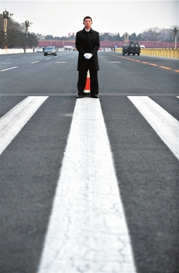 最嚴肅·黑色制服。身著黑色制服的安保人員在人民大會堂旁的人行道上執勤。