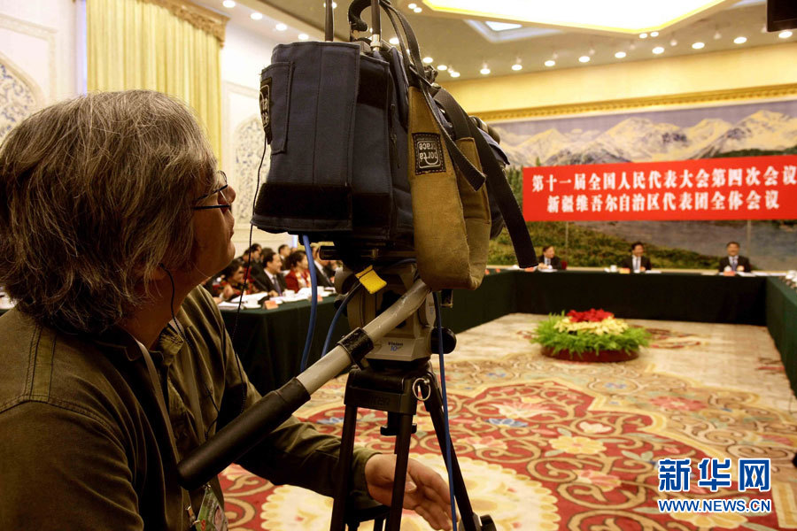 3月8日,出席十一屆全國人大四次會議的新疆代表團在北京人民大會堂舉行全體會議。這是一位來自日本媒體的記者在現場采訪拍攝。新華社記者 鄭煥松 攝