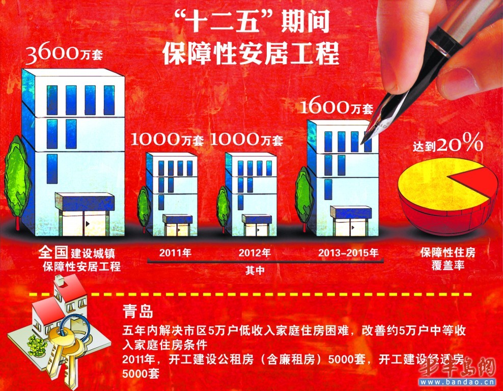 2月25日,在青島市十四屆人大四次會(huì)議召開的新聞發(fā)布會(huì)上,市政府辦公廳發(fā)布了2011年市政府在城鄉(xiāng)建設(shè)和改善市民生活方面重點(diǎn)辦好的 12件實(shí)事。其中在保障性住房方面,年內(nèi)開工建設(shè)公共租賃住房(含廉租住房)5000套,市財(cái)政投資4.5億元。年內(nèi)開工建設(shè)經(jīng)濟(jì)適用住房5000套,通過項(xiàng)目的實(shí)施,進(jìn)一步增加保障性住房建設(shè)和供應(yīng),解決城市低收入家庭的住房困難。