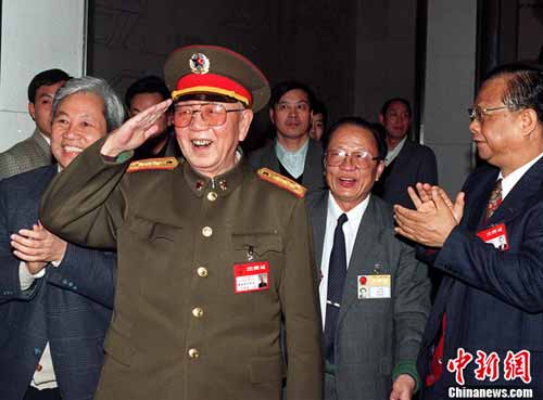 圖為1996年3月15日,中央軍委副主席劉華清十五日到全國人大廣東團參加分組討論,向代表們敬禮致意。中新社記者 宗金柱 攝