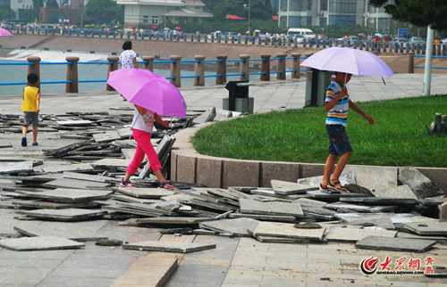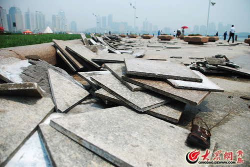 [提要] 受昨夜臺風“ 梅花”帶來的巨大海浪的影響,五四廣場海邊的護欄均有一定程度的損壞,音樂廣場受損較為嚴重,據估計有數百平米的地板磚被巨浪沖毀,相關單位正在緊張的對受災情況進行統計。