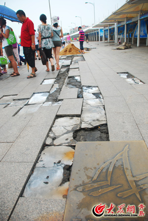 大眾網青島8月8日訊(記者 孫雯麗)在青島市人民政府防汛抗旱指揮部發布“解除全市防臺風二級 預警和應急響應”的通告后,青島前海景區也于今天上午按照正常營業時間陸續開放。今天上午,記者在五四廣場、音樂廣場的沿海一帶看到,受昨夜臺風“ 梅花”帶來的巨大海浪的影響,五四廣場海邊的護欄均有一定程度的損壞,音樂廣場受損較為嚴重,據估計有數百平米的地板磚被巨浪沖毀,相關單位正在緊張的對受災情況進行統計。