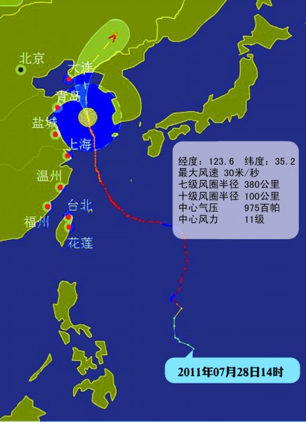 7日17時(shí),“梅花”的中心位于青島市東南方向大約410公里的海面上,就是北緯33.8度,東經(jīng)123.9度,近中心最大風(fēng)力12級(jí)(33米/秒),中心氣壓970百帕。