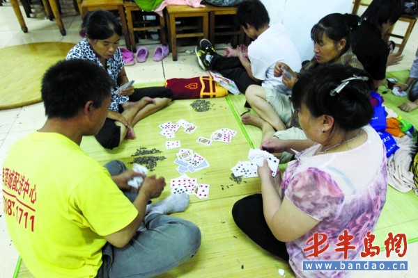 被轉移到嶗山六中的漁民湊到一起打起了撲克。